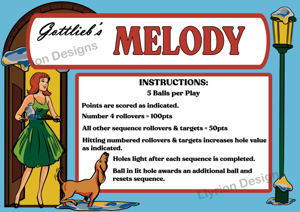 Instructions and credit apron cards for Gottlieb's Melody pinball machine.